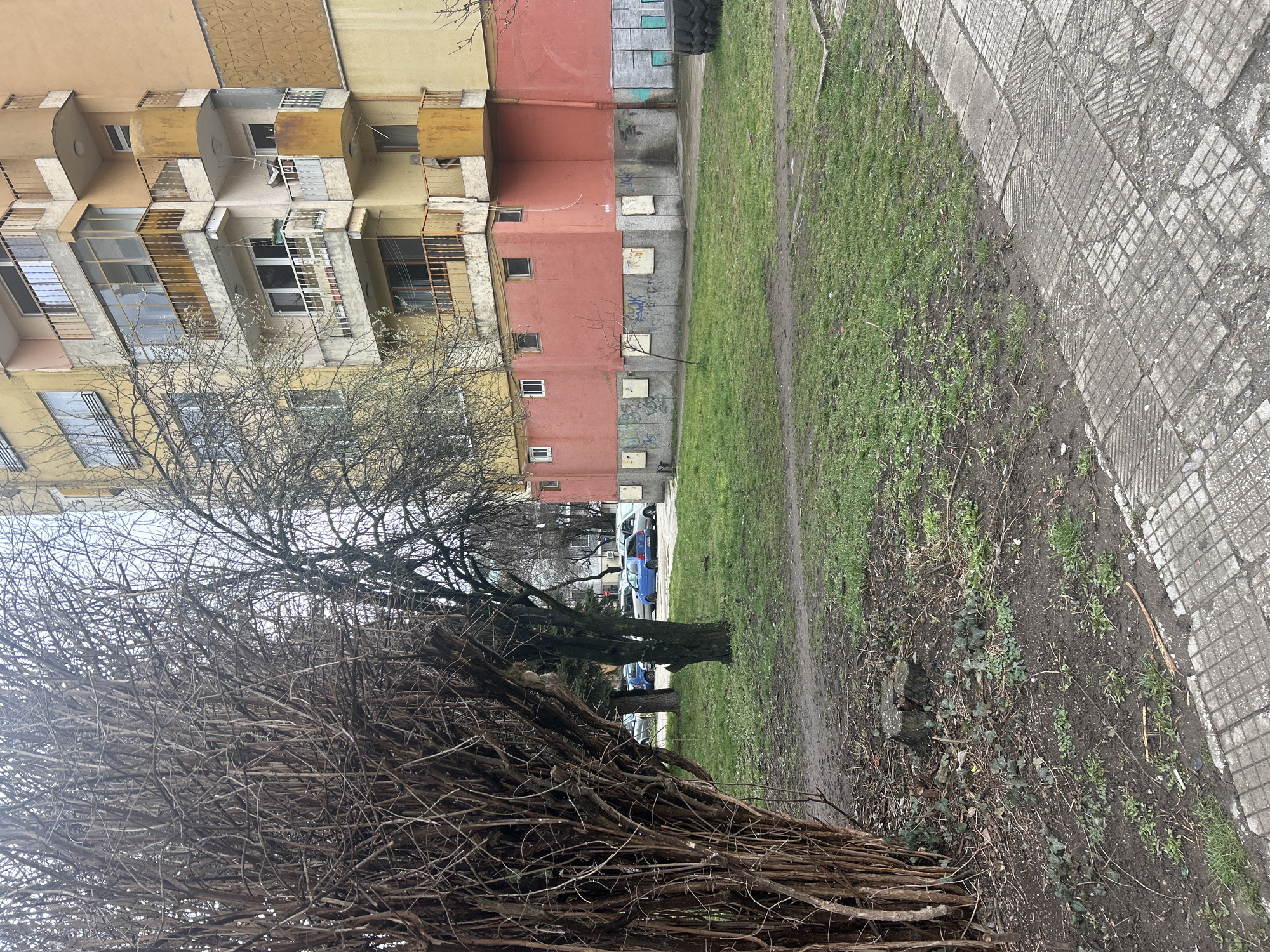 This image captures a wide-angle view of an urban landscape in Pernik, Bulgaria, likely depicting a residential area in late winter or early spring. The scene is dominated by an apartment building on the right and bare vegetation on the left. The multi-story apartment building exhibits a weathered facade, primarily colored in faded orange and yellow tones on its upper sections. The ground floor is painted a distinctive reddish-pink, with several small, white-framed rectangular windows, some of which appear boarded from the exterior. Below these windows, the concrete foundation is exposed, showing signs of wear, discoloration, and graffiti, including the visible text "RC 50." A large, dark, industrial-style tire rests on the ground against the building's base on the far right. Multiple balconies protrude from the building's upper floors; these vary in design, with some featuring enclosed glass panels and others open with rusted yellow or orange metal railings. The concrete elements of the balconies also show significant weathering and staining. In the foreground and mid-ground, a substantial portion of the scene is occupied by vegetation. On the far left, a dense, multi-stemmed shrub or small tree stands prominent, its bare, intricate network of dark brown branches devoid of leaves. Further back, several other deciduous trees with dark trunks and branches are also bare, indicating a dormant season. The ground beneath these trees and extending towards the building is a mix of patchy green grass and areas of exposed, dark brown soil. A tree stump is visible in the bare earth near the large foreground shrub. A concrete sidewalk, composed of square pavers with a grid-like embossed pattern, occupies the lower right portion of the image. The pavers display cracks and signs of degradation. Beyond the trees in the mid-ground, several passenger vehicles are parked on what appears to be an unpaved or gravel lot, with at least two blue sedans clearly identifiable among other lighter-colored cars. The sky is overcast and light gray. No individuals are visible in the scene, and no explicit actions or interactions are depicted.