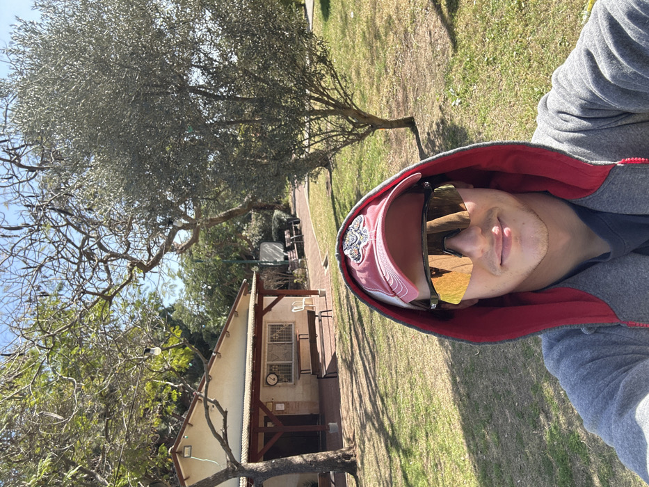 This image is a selfie photograph of a male subject in an outdoor park environment in Hod HaSharon, Israel, under a clear blue sky