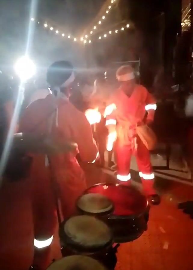 Two people in orange jumpsuits are performing with drums and fire at an outdoor event