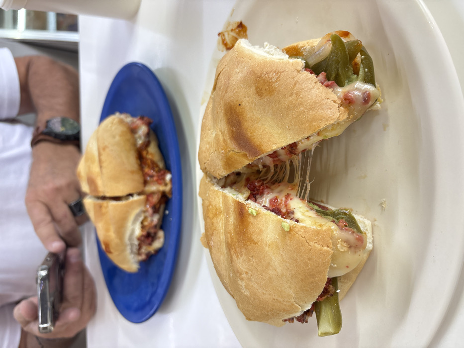 Two cut tortas are presented on plates. The torta on the white plate features melted cheese, chorizo, jalapeños, and avocado. The cheese is stringy, highlighting its melted consistency. The torta on the blue plate is also cut and shows similar ingredients inside. A partial view of a person with a watch and phone is visible on the left side.
