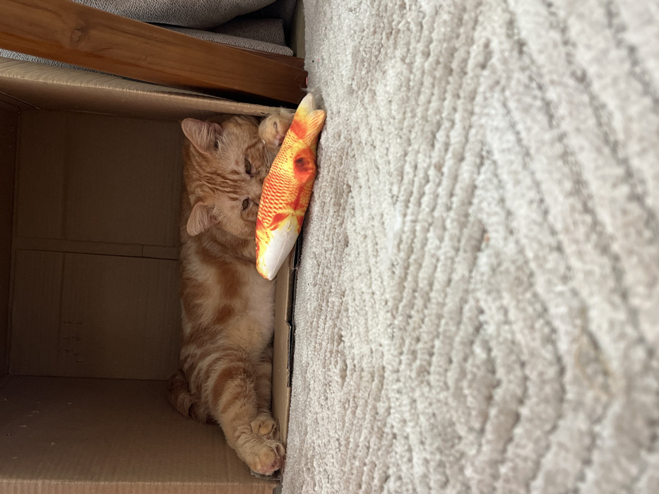 An orange tabby cat lies in a cardboard box, cuddling an orange and white fish-shaped toy
