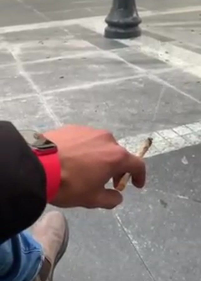 A first-person perspective shows a person sitting in a chair, holding and smoking a rolled cigarette. The background is an outdoor city scene on a cloudy day. The person takes a drag from the cigarette, and then the camera focuses on the surrounding area, which includes a black lamppost, gray paving stones, a crosswalk, and a building. In the distance, there are three individuals wearing dark uniforms, potentially security or police, standing on the street. A blue bus passes behind them. A tree is visible to the left.
