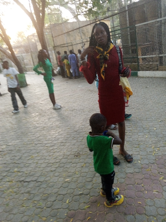 A woman in a red dress stands with a small child in a green shirt. The child looks to the side while holding an object. Behind them, people gather near a caged area. Other individuals are scattered in the background, including one in a green dress. The setting appears to be an outdoor public space, possibly a park or zoo, with trees and paved ground.