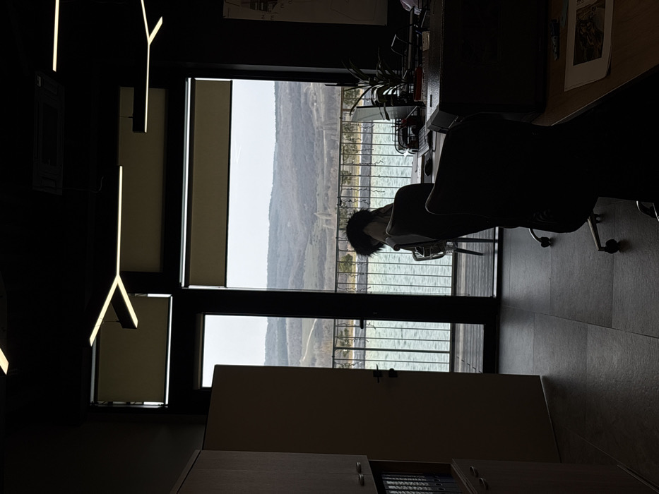 The image depicts an interior view of an unoccupied modern office space with an extensive exterior vista, situated in Зеленогорское сельское поселение, Ukraine. The indoor environment features a dark ceiling with two illuminated Y-shaped linear LED fixtures and an overhead air conditioning vent. Light-toned wooden cabinetry containing binders is positioned along the left wall. The floor consists of dark square tiles. A large glass facade, comprising a partially ajar door on the left and windows with lowered roller blinds on their upper sections, forms the rear boundary. Inside, several dark office chairs are observed; one positioned near the window is draped with a dark, textured material. A workstation adjacent to the window includes a laptop, a potted plant, and a desktop organizer. Papers with visual content are visible on a desk in the immediate foreground. The exterior view reveals a wooden deck bordered by a metal railing, overlooking a distinct turquoise-green body of water. Beyond the water, a distant landscape of undulating hills, characterized by sparse deciduous vegetation and visible patches of earth, extends under an overcast sky. No human presence or activity is observable within the frame.