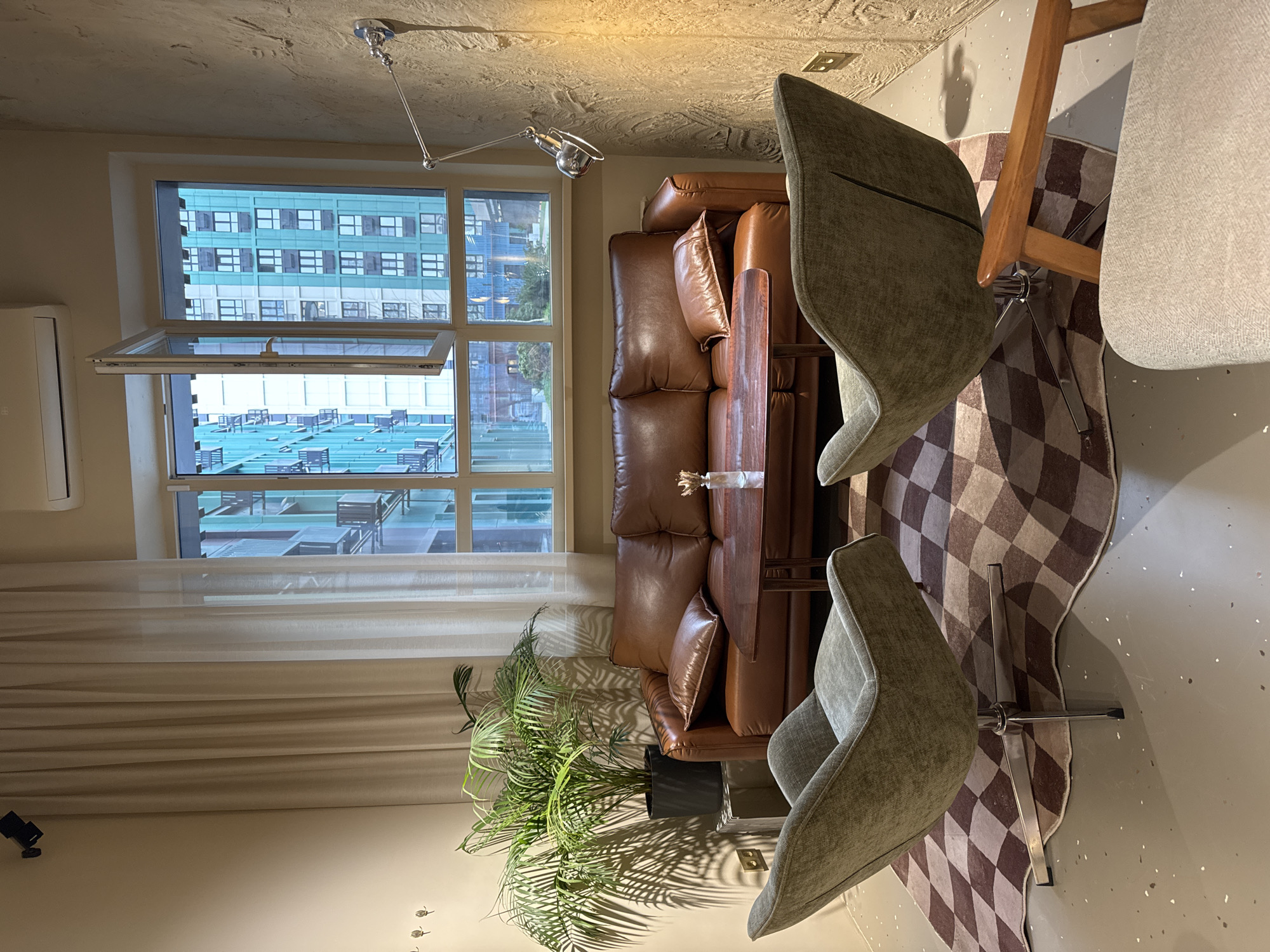 The image depicts an interior space with a window offering a view of an urban landscape, potentially in Azov, Russia. The building across the street is likely an apartment building, given the repetitive pattern of windows. Inside, there's a brown leather sofa with pillows, a dark wooden coffee table with decorative items, two grey upholstered chairs, and a potted plant. A rug with a brown and white checkered pattern is beneath the chairs. A wall-mounted lamp is positioned near the window. The window is partially open.