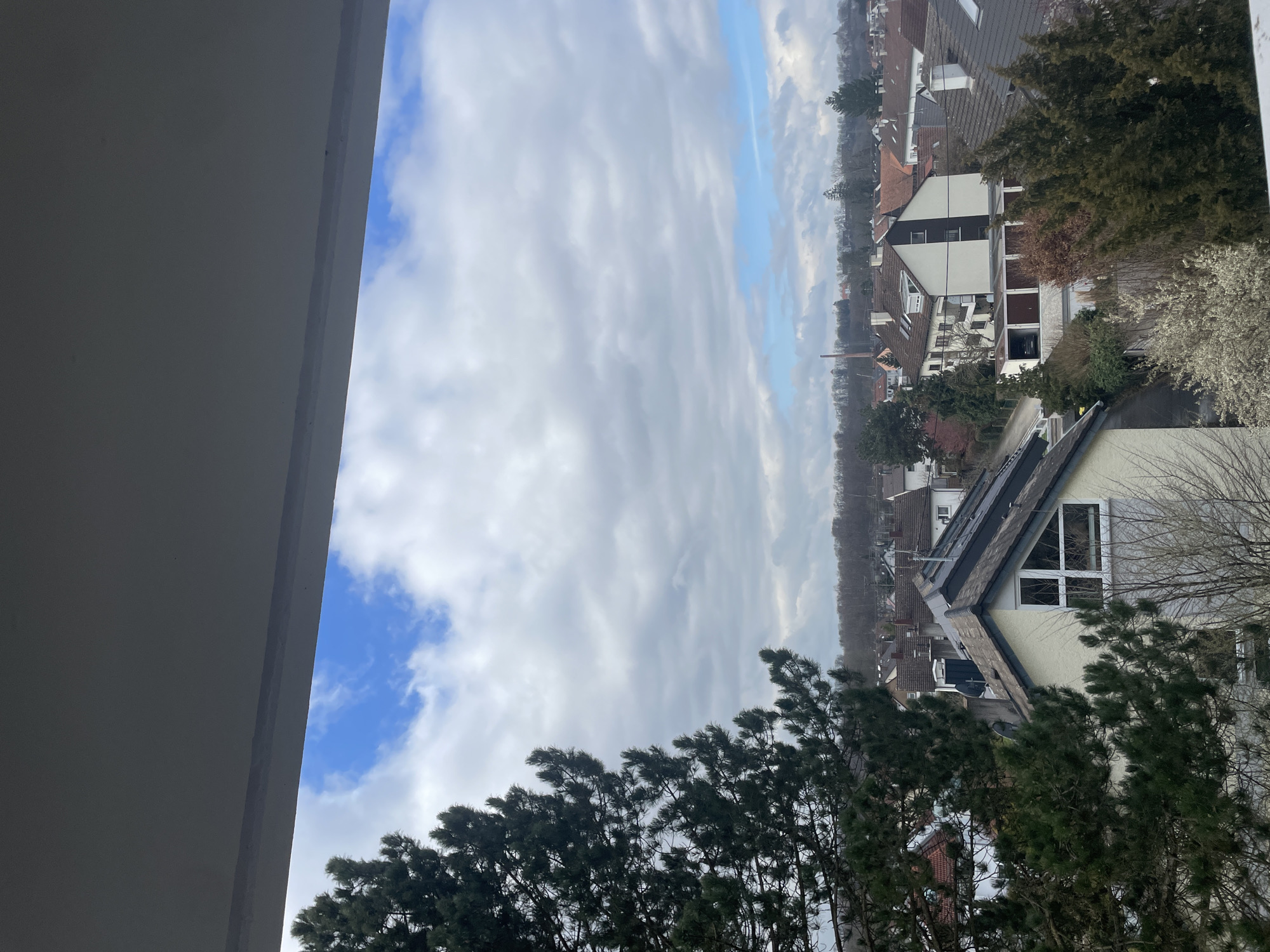 An elevated, static view overlooks a residential area in Senden, Germany, under a partly cloudy sky. The top approximately 20% of the frame is occupied by a light gray concrete or painted architectural overhang, indicating a balcony or window perspective. The sky exhibits a mixture of dense, light gray stratocumulus clouds and patches of clear blue sky, predominantly in the upper left and center-right. In the immediate foreground, a dense, dark green coniferous tree with needle-like foliage occupies the left side of the frame, extending from the bottom edge upwards. Behind and partially obscured by this tree, a multi-story residential building with light yellow walls and a dark gray pitched roof is visible. Its roof features multiple dark panels, possibly solar, and a prominent white-framed dormer window with a multi-pane grid. A dark chimney stack rises from this roof. The mid-ground comprises a dense cluster of detached and semi-detached residential houses with varying architectural styles common to European towns. Roofs are predominantly pitched, in shades of dark gray and reddish-brown, many featuring chimneys. One notable structure to the right of the foreground house displays a series of brown garage doors at ground level. Interspersed among the buildings are various deciduous trees, some bare, others displaying early spring blossoms in white or light pink, and several smaller dark green evergreen shrubs. The distant background is marked by a continuous, dark line of bare deciduous trees, suggesting a forest or wooded area forming the horizon. Above this tree line, on the left, a slender, reddish-brown industrial chimney rises. To the right, a distant, slender church spire is visible against the sky, indicating a significant landmark within Senden. No people, vehicles in motion, or specific actions are discernible within the frame.