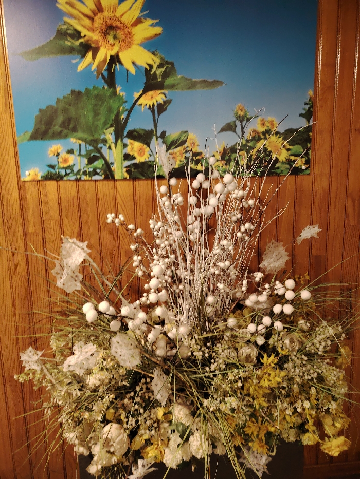 A lush floral arrangement dominates the view, filled with white berries, sprigs of greenery, and various white and yellow flowers. The arrangement sits against a wood-paneled wall featuring an artwork depicting sunflowers in a blue sky. The combination of the lively floral arrangement and the sunflower artwork creates a warm, inviting atmosphere.