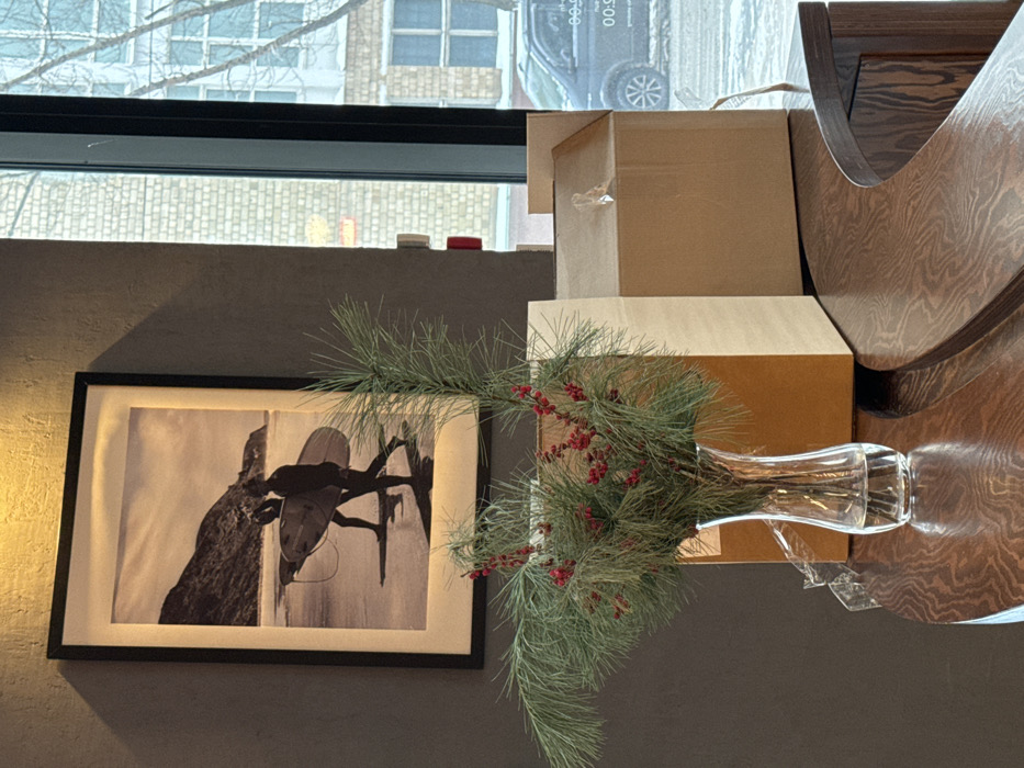 A framed black and white photograph depicting a surfer on a wave is displayed against a gray wall, beside a clear glass vase holding sprigs of greenery with red berries. The vase is positioned near two stacked cardboard boxes. In the background, a window reveals a building across the street and a car parked on the street. Part of a wooden chair is visible on the right side of the frame.