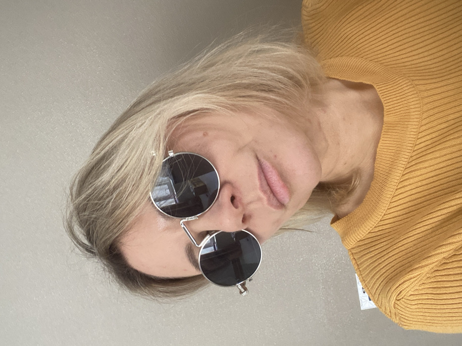 A woman poses, wearing round sunglasses with a silver frame. Her hair is blonde with darker roots. She's dressed in a mustard-yellow sweater with a ribbed texture. The background is a neutral, light-colored wall. The image is slightly tilted to the right. The angle is from a higher perspective, looking down at her face.