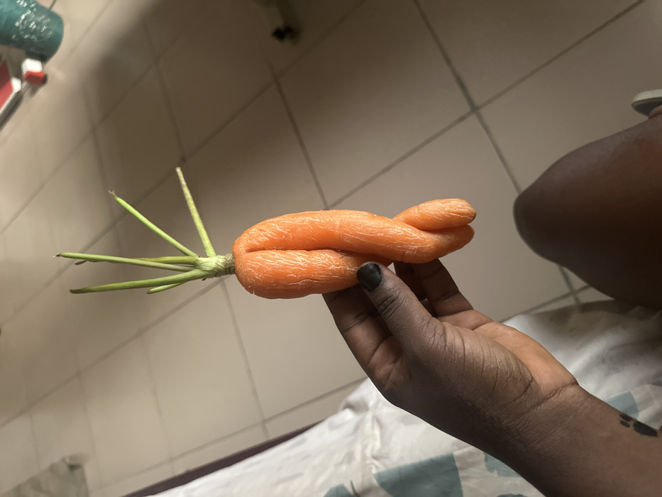 A dark-skinned person holds an orange carrot with green stems. The carrot's unusual, fused shape suggests it grew connected to another carrot. The person’s hand has short, black-painted nails and is set against a patterned white surface. The background features a tiled wall and a glimpse of a person's leg and foot. The shot focuses on the unusual carrot and the hand holding it.