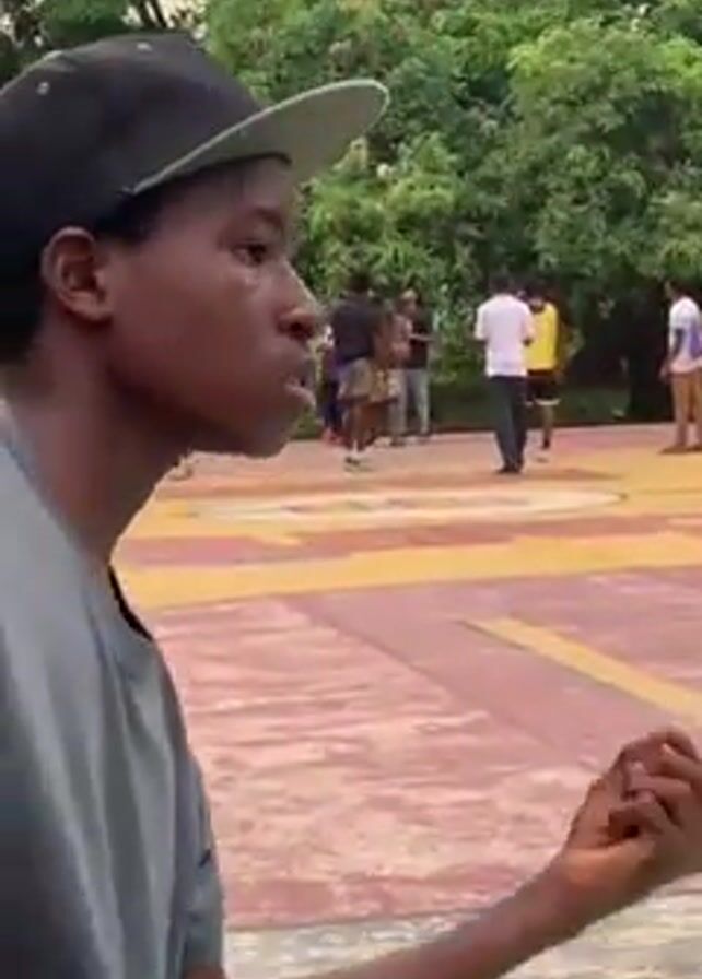 n outdoor basketball game on a colorful court surrounded by green trees and a few people watching. The camera focuses on a young man in a grey shirt and black cap as he watches the game. Players in different colored jerseys (yellow, white, and purple) can be seen on the court. Some people are standing around the court as spectators or filming. There is a sign on the basketball hoop. The court is painted with yellow and maroon-colored markings. The overall setting appears to be a public park or recreational area.