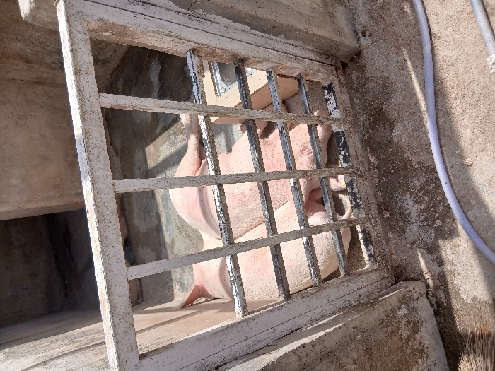 A pink pig is seen behind a white metal grate. The pig is large and partially obscured by the bars. The surrounding structure appears to be a concrete enclosure with a weathered and dirty appearance. A white hose is visible along the top right. The scene is enclosed, suggesting a livestock pen or similar environment.