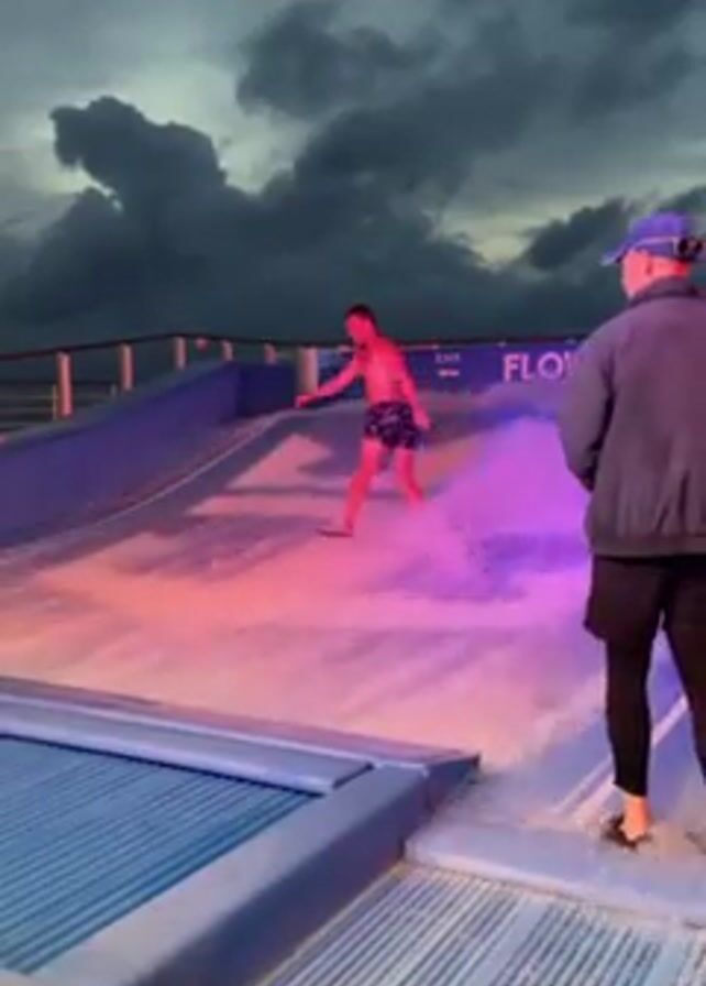 A man stands on a FlowRider, an artificial wave machine, at twilight