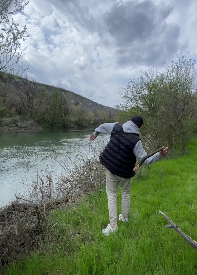 A person stands by a river throwing a stick into the water. The person wears a black vest over a gray sweatshirt, beige pants, and white sneakers. They also wear a black baseball cap. The river is green and flows between grassy banks and sparse trees. The sky is overcast with gray clouds. A wooded hillside is visible in the background. The person throws the stick into the river and watches it float away.