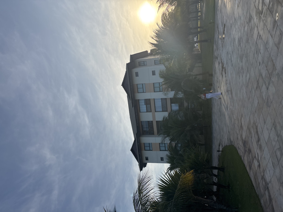 This image captures an outdoor scene in Caucaia, Brazil, under a sky with scattered cirrus clouds and a low sun casting warm light from the right, consistent with either sunrise or sunset. The prominent subject is a multi-story building, approximately four to five visible floors, featuring a light-toned facade, numerous dark-framed windows, and balconies with dark railings. It is topped with a dark tiled roof. Surrounding the building are numerous palm trees and areas of manicured grass. The foreground and mid-ground are dominated by a paved surface composed of light-colored rectangular tiles, exhibiting isolated patches of moisture. A single individual is observed walking on this paved surface, moving towards the right side of the frame, dressed in light-colored pants and a reddish top.
