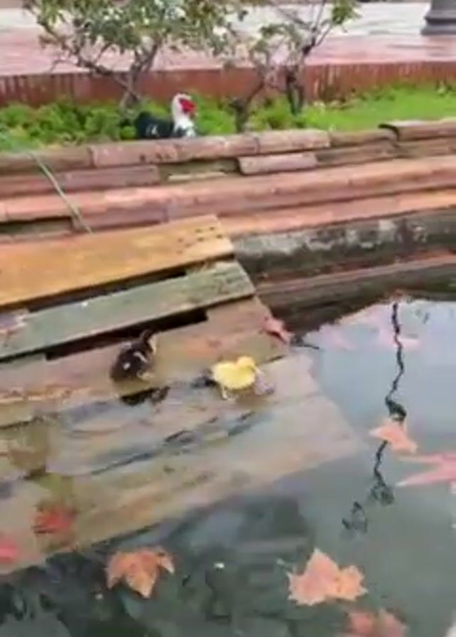 two ducklings swimming in a pond. One is yellow and the other is black. There are fallen leaves floating in the pond and a makeshift wooden platform in the water. A duck stands on the bank of the pond. In the background is a large brick building. A person can be heard speaking in French.