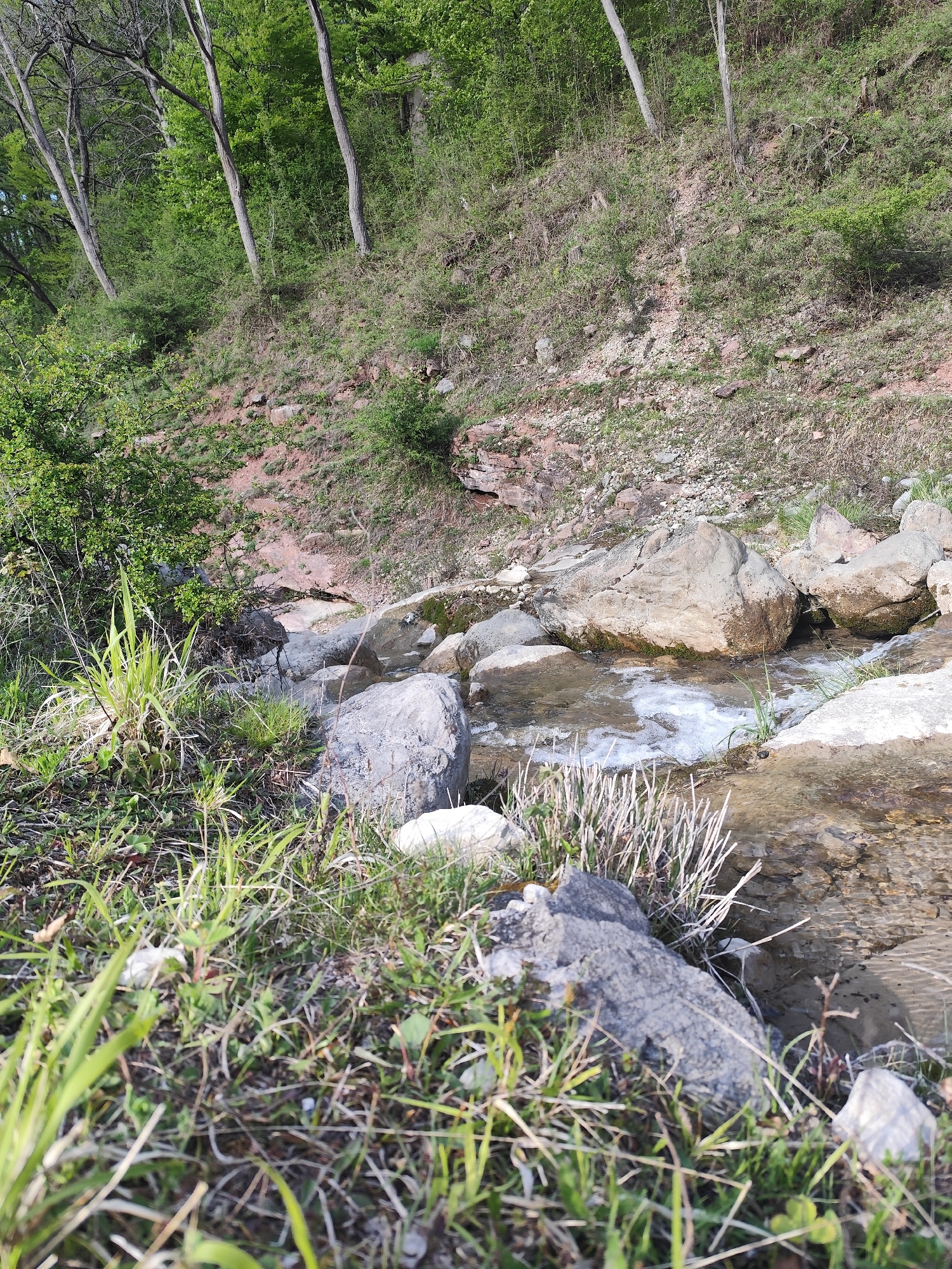 stream flowing through a rocky, grassy area. The stream is bordered by rocks and vegetation, with a wooded slope rising in the background. The location is in the city of Vratsa, Bulgaria.