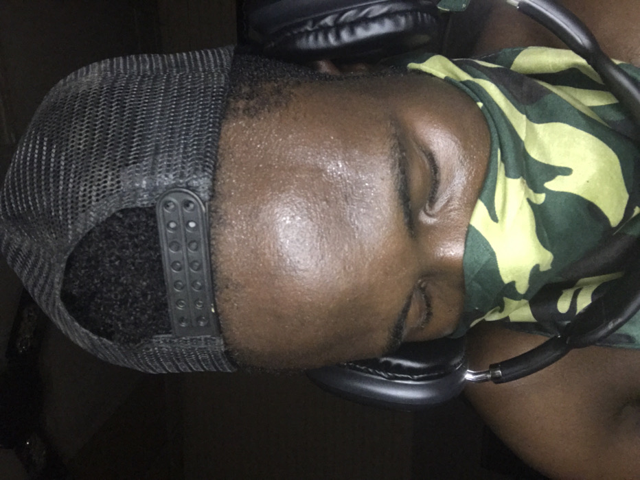 This image, taken in Narayi, Nigeria, depicts a close-up, dim-lit view of an individual, likely male, from the upper chest upwards. The person has dark skin and appears to be looking downwards with eyes closed. A dark grey mesh trucker cap is worn backward, revealing short, dark, textured hair and the cap's plastic snap closure mechanism at the rear. The lower half of the face, including the nose and mouth, is covered by a green, light green, black, and brown camouflage-patterned bandana. Black over-ear headphones are worn, with the earcups visible against the ears and the band resting around the neck. The individual's forehead and visible facial skin show a slight sheen. The background is dark and indistinct, offering no specific environmental details beyond low light conditions.