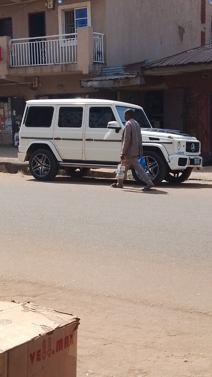 The image displays a daytime street scene in Shaba, Nigeria. A white Mercedes-Benz G-Wagen SUV is stationary, parked parallel to a paved road on the right side of the frame. The vehicle features a black hood scoop, silver running boards, and black alloy wheels with a multi-spoke, starburst design. Its front license plate is partially visible. A lone male individual, dressed in a light brown traditional top, light blue trousers, and dark sandals, is walking from right to left across the midground, passing in front of the parked G-Wagen. He carries a white plastic bag in his right hand and a blue plastic bag in his left hand. In the background, a multi-story building with a light-colored facade is visible, featuring a white metal balcony railing on its second floor and windows. To the right of this, a smaller structure with a corrugated metal roof is present. The lower-left foreground shows the corner of a brown corrugated cardboard box with "VELL.MAX" printed in red on its side.