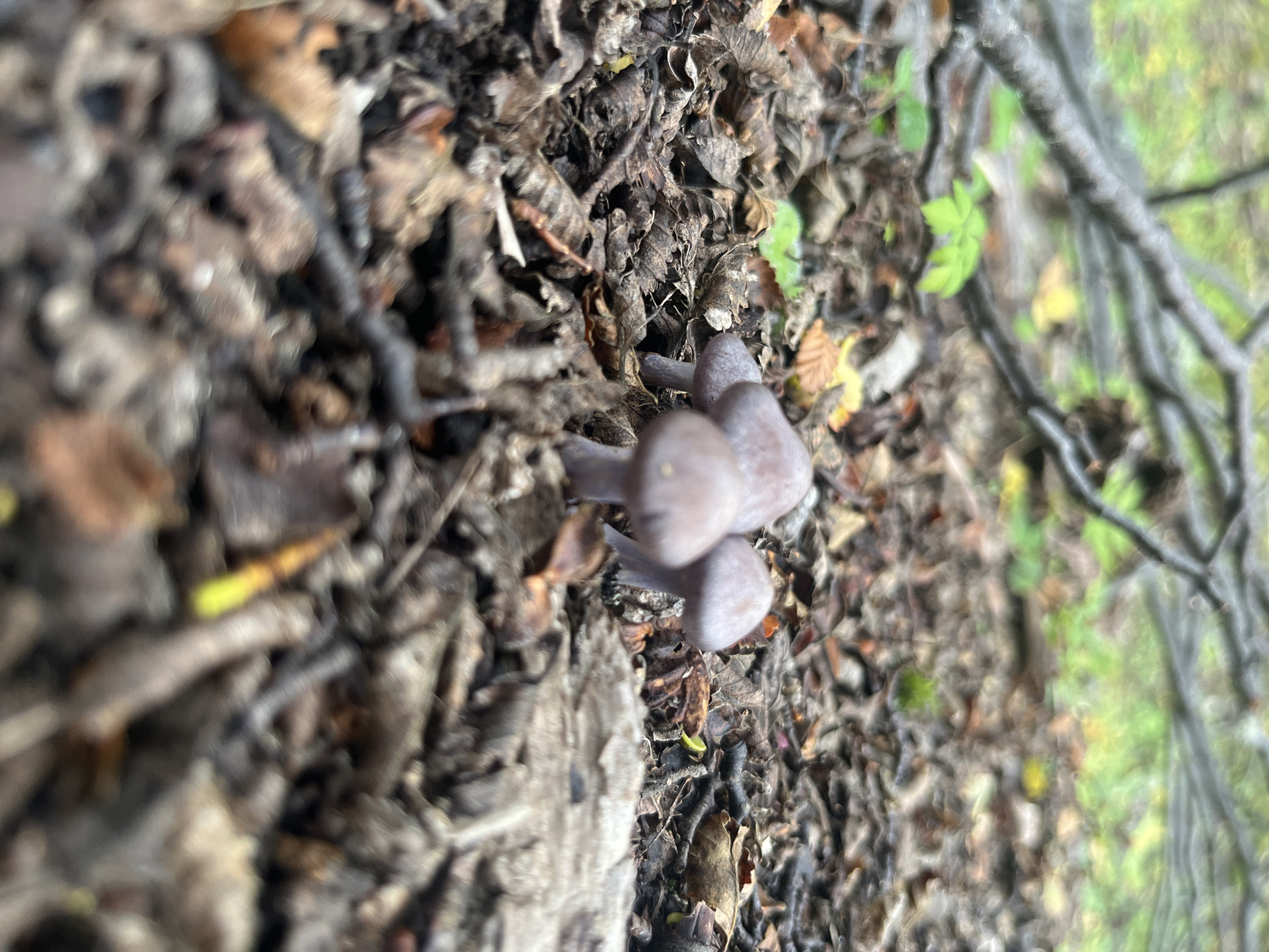 three small, grey-brown mushrooms growing among dead leaves and twigs on a forest floor