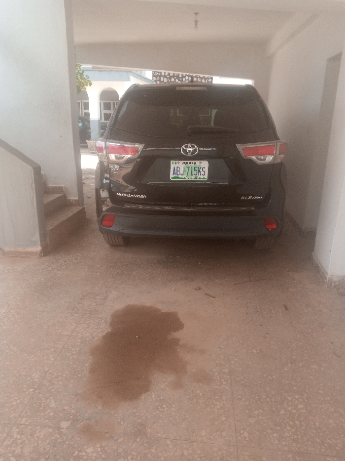 The scene depicts a black Toyota Highlander XLE AWD SUV parked in a semi-enclosed concrete parking area within the city of Jos, Nigeria. The vehicle is positioned facing away from the camera, displaying a green Nigerian license plate, ABJ-715KS, which indicates registration in Abuja. The concrete floor beneath the vehicle features a prominent, dark, irregularly shaped liquid stain, approximately 0.5 to 0.7 meters in diameter, located centrally in front of the rear bumper. To the left, a concrete staircase with brown treads ascends along a light-colored wall. The background beyond the vehicle reveals parts of another building with arched windows and some green foliage under natural light. No individuals, actions, or interactions are present in the image.