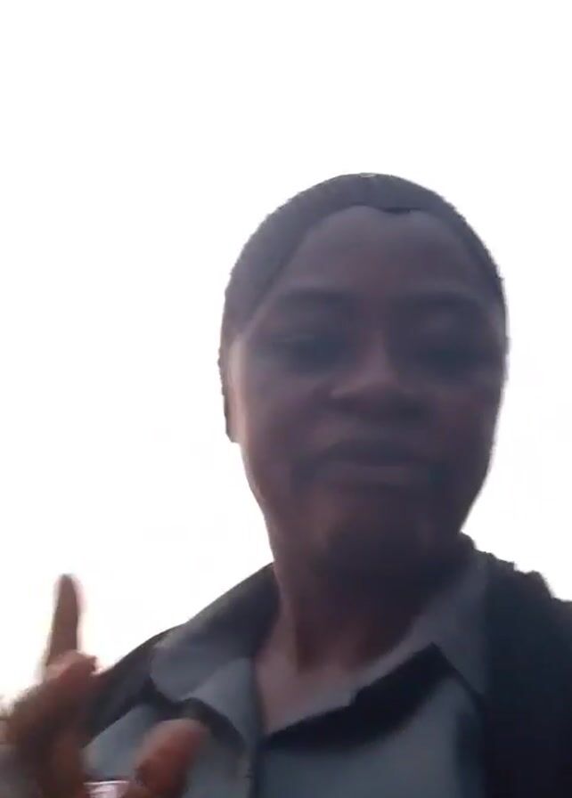 A woman with dark skin and short dark hair is centered in the frame against a bright white sky. She's wearing a gray collared shirt with a small patch on the left breast and a black jacket. The woman has a dark head covering that appears to be beaded or sequined. She's looking directly at the camera with a neutral expression. Her hand is briefly raised, showing the palm towards the camera. In the background, a palm tree and a building are slightly visible. The bottom left corner of the frame shows the text "itel P40 4G."