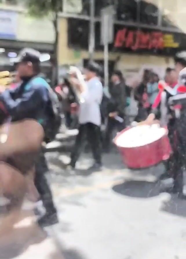 group of young people marching down a city street, playing musical instruments