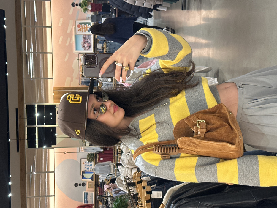 A young individual, presumed female, is depicted in a mirror selfie taken inside a retail clothing store in Glendale, United States. The subject has long, dark hair and is wearing a brown baseball cap with a yellow "SD" logo, small reflective cat-eye sunglasses, a silver cross pendant necklace, a yellow and grey horizontally striped cropped quarter-zip sweater, and a light grey pleated skirt. A brown suede shoulder bag with a buckle and ribbed handle is slung over her right shoulder. Her left hand, holding a dark-colored smartphone with a visible MagSafe ring on its back, displays French-tipped nails, a rectangular silver-toned ring on the index finger, and a gold-toned circular ring on the middle finger. The background reveals a commercial retail space with clothing racks displaying various garments on both sides. The store features a light-colored floor, exposed wooden ceiling beams, recessed lighting, and pastel-toned walls adorned with minimalist art pieces. Another person, wearing a dark blue top, is partially visible in the background.