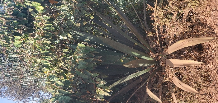 A ground-level shot captures a variety of foliage. Dominating the scene is a plant with long, pointed, green leaves emerging from a central point. Adjacent to this plant is a dense collection of leafy bushes, their leaves a lighter green compared to the pointed-leaf plant. The ground around the plants is covered in dry, brown soil. In the background, hints of a distant tree under a clear blue sky are visible.