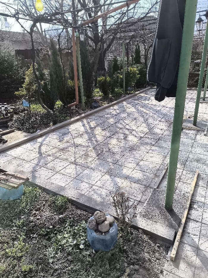 An outdoor scene in the city of Unknown, Unknown, depicts a paved patio area adjacent to a garden under a pergola structure. The patio is constructed from square, light-colored pavers, exhibiting scattered debris and distinct dappled shadows from the overhead framework. A dark garment, resembling a jacket with white arm stripes, hangs from a vertical green metal post of the pergola on the right. Additional green metal posts and horizontal support beams form the pergola. To the left, a garden area features various evergreen shrubs, bare deciduous trees, and sparse ground cover. A small blue planter containing several rocks sits in the foreground garden patch, next to a small, bare-branched plant. Further into the garden, a larger blue object, possibly a painted tire, holds several reddish-brown objects. A wooden plank lies on the paved surface near the right foreground post. In the background, additional trees and a partial view of a building with a tiled roof are visible. The scene is illuminated by natural sunlight, indicated by prominent shadows. No individuals are present.