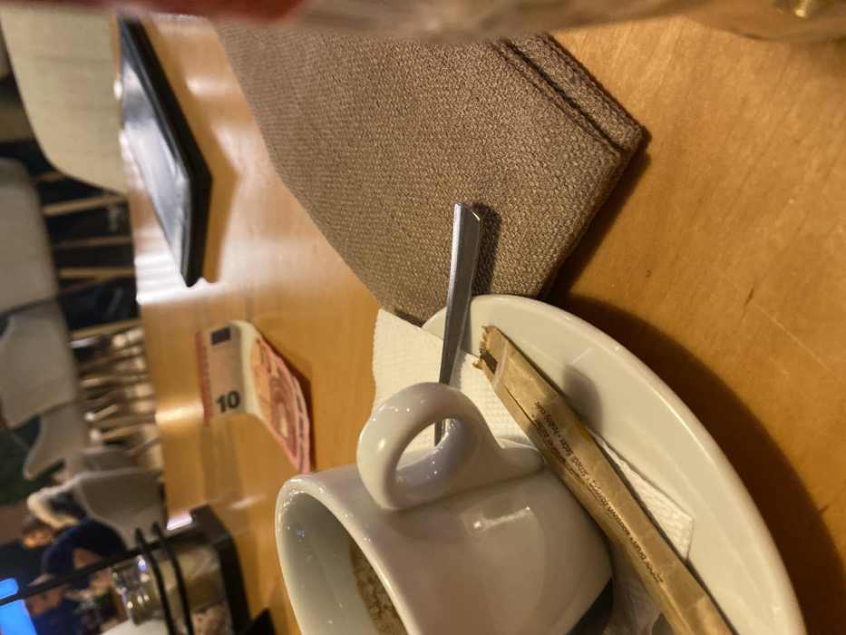 A forensic description of the image reveals an indoor scene set within an unspecified cafe or restaurant in the city of Pazardzhik, Bulgaria. The primary focus is a wooden tabletop, upon which a white ceramic coffee cup, containing a dark beverage with a light froth, rests on a white saucer. A silver spoon is positioned on a crumpled white paper napkin beneath the cup's handle. A partially opened brown paper packet, labeled with "кафява захар" (Bulgarian for brown sugar) and other languages, lies on the saucer. Adjacent to the coffee setting, a folded brown textile napkin is present. Further back on the wooden surface, a single 10 Euro banknote lies somewhat crumpled. To the right of the banknote, a black electronic device, appearing to be a smartphone or small tablet, rests face down. A blurred, translucent object, possibly a glass or bottle, is partially visible at the extreme right edge of the frame. The background is out of focus, showing the interior of a commercial establishment. Visible elements include light-colored chairs, additional tables, and indistinct human figures, suggesting other patrons. A dark, rectangular object, possibly a screen or window, is dimly discernible in the upper left background. The overall lighting is consistent with an indoor environment.