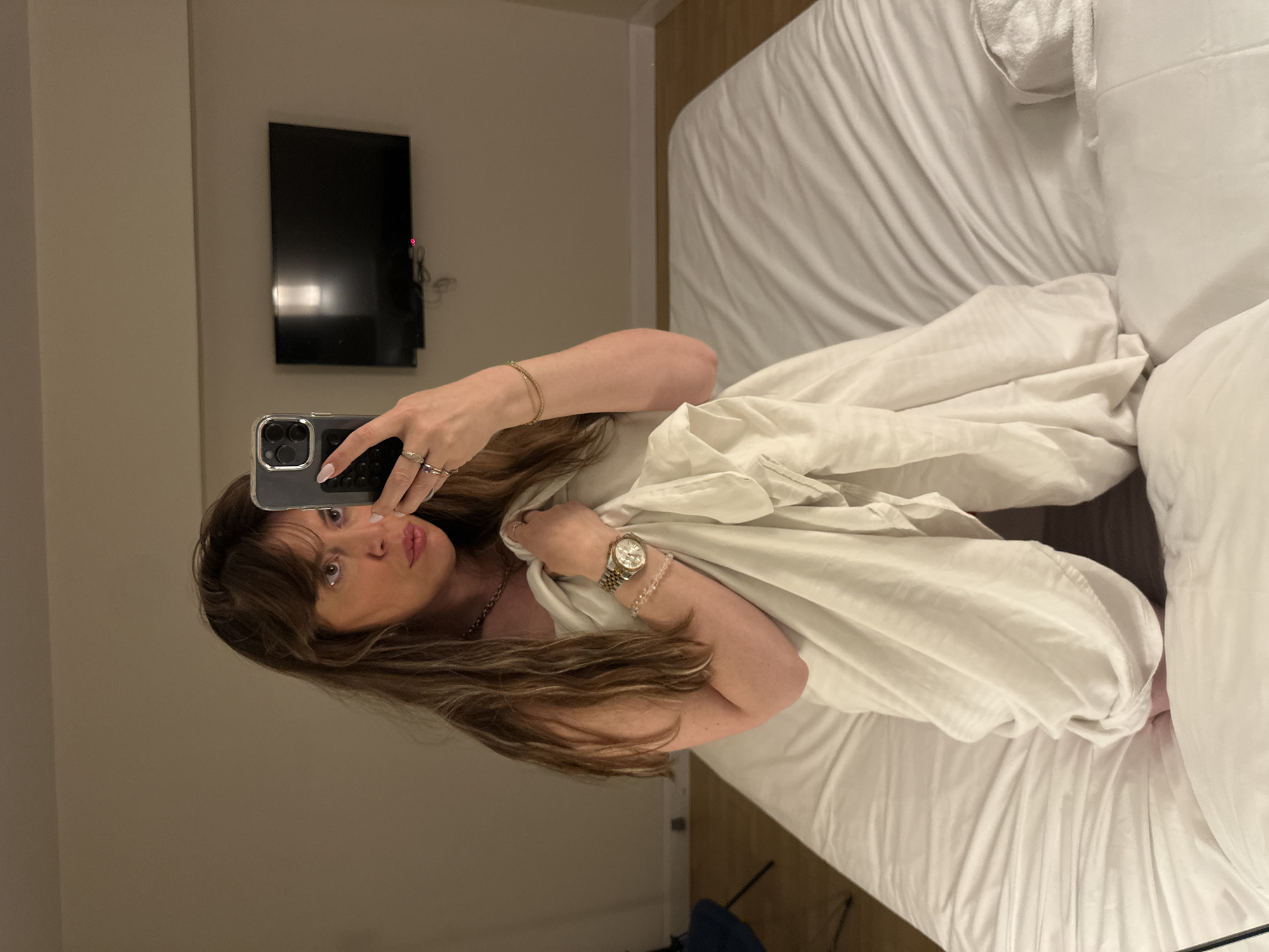A woman is taking a selfie in a hotel room. She is partially covered by a white duvet on a bed with white linens. Her hair is long and brown with blonde highlights. She wears rings, bracelets, and a watch. A television is mounted on the wall. The image appears to be taken in a mirror, likely in a hotel bathroom or dressing area. The location is potentially Batumi, Georgia.