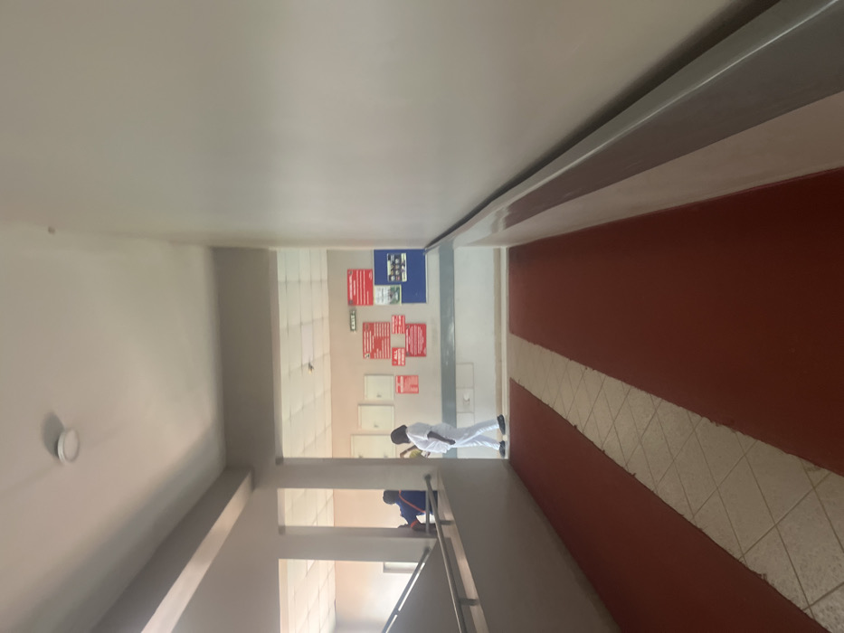 The image depicts an indoor scene within a building located in Idimu, Nigeria, specifically a corridor or hallway featuring an accessible ramp and a staircase. The perspective is from the bottom of a wide, upward-sloping ramp. The ramp's surface is predominantly reddish-brown, with a central, narrower stripe of white tiled flooring running its length. A light-colored handrail is mounted along the right wall of the ramp. To the left, a portion of a staircase with a corresponding handrail ascends. Beyond the top of the ramp and staircase, the corridor continues, illuminated by what appears to be ambient light from an unseen source. Two individuals are present: 1. One person, dressed in white scrubs and dark shoes, stands near the end of the ramp on the main corridor level. This individual is facing generally away from the camera, turned slightly to their right, and appears to be holding a yellow object in their hands. 2. A second person, wearing a blue top and dark trousers, is partially visible further back on the left, near the staircase, facing away from the camera. The walls are painted a light, neutral color, possibly off-white or light grey. The ceiling is flat and light-colored, featuring a single circular white light fixture or smoke detector near the top-center of the frame. On the far wall at the end of the corridor, several items are affixed: * Multiple rectangular white panels, possibly access covers or electrical boxes. * Several red-framed notice boards displaying white text. * A green "EXIT" sign with white lettering positioned above the notice boards. * A blue bulletin board with various papers pinned to it, located to the right of the red notice boards. The environment suggests a public or institutional building, such as a hospital or clinic, given the presence of a person in medical attire and the informational signage.