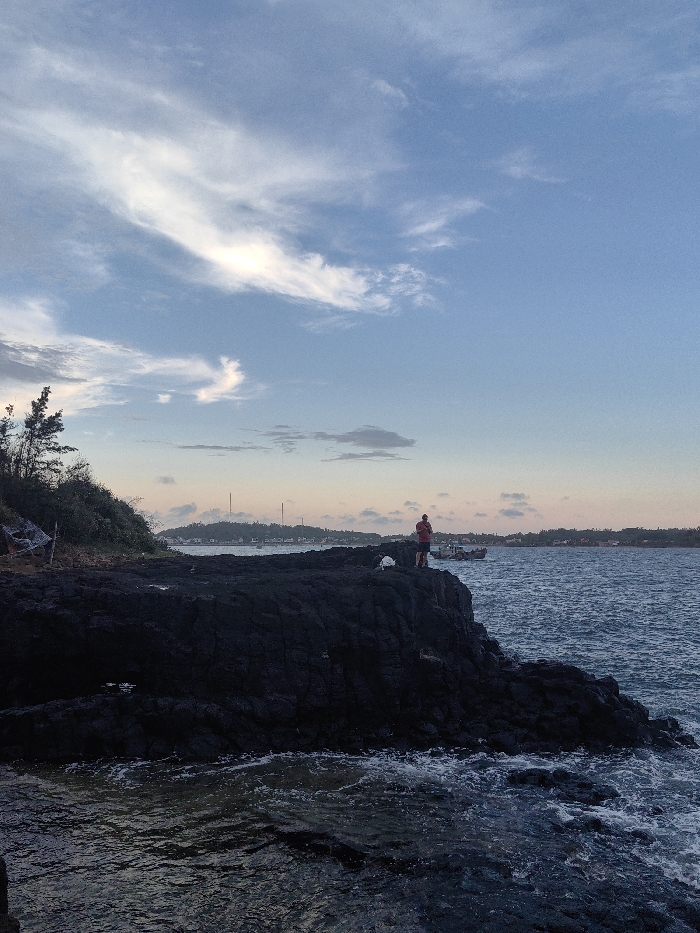 This image depicts a coastal scene in Thành phố Quảng Ngãi, Vietnam, observed during a period of low light, consistent with dawn or dusk. The foreground and mid-ground are dominated by extensive dark, rugged rock formations that extend into the sea. The water immediately adjacent to these rocks shows turbulence and white foam from breaking waves. On an elevated section of a rocky outcrop, slightly right of the frame's center, a solitary individual stands with their back to the viewer, facing out towards the water. The person wears a red shirt and dark trousers or shorts. A white object, possibly a cooler or container, rests on the rocks beside the individual. To the left, a vegetated hillside rises, covered in dark green scrub and trees, with a piece of light-colored netting or fabric visible among the vegetation near the waterline. The sea, a dark blue-grey, exhibits surface ripples and small waves. In the middle distance, several small boats, consistent with fishing vessels, are visible on the water to the right of the rocky outcrop. The distant horizon reveals a low-lying landmass or island featuring scattered structures and at least two prominent vertical towers. The sky, occupying the upper two-thirds of the image, transitions from a pale blue overhead to a lighter, pinkish-blue near the horizon, containing sparse, wispy white clouds partially illuminated by a diffused light source.