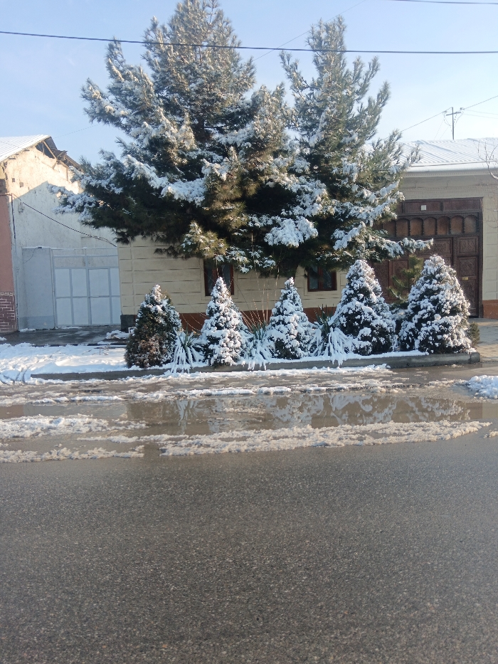 The scene depicts a winter street view in Andijan City, Uzbekistan. The foreground presents a dark gray asphalt road with irregular patches of melting snow and slush, exhibiting reflections of the sky and surroundings. A low concrete curb separates the road from a landscaped strip in the midground. This strip contains a linear arrangement of five conical evergreen shrubs and other smaller yucca-like plants, all heavily laden with white snow. Behind these plants, a large, multi-trunked evergreen tree, likely a pine, stands with its branches extensively covered in snow. In the background, two residential-style buildings are visible: a light-colored structure on the left with a white metal roll-up or sliding gate, and to its right, a cream-colored building featuring dark-framed windows and a large, intricately carved brown wooden double-gate. Both buildings have snow partially covering their roofs. The sky is clear and light blue. Overhead utility lines are visible crossing the upper portion of the frame. No individuals or vehicles are present within the depicted area.