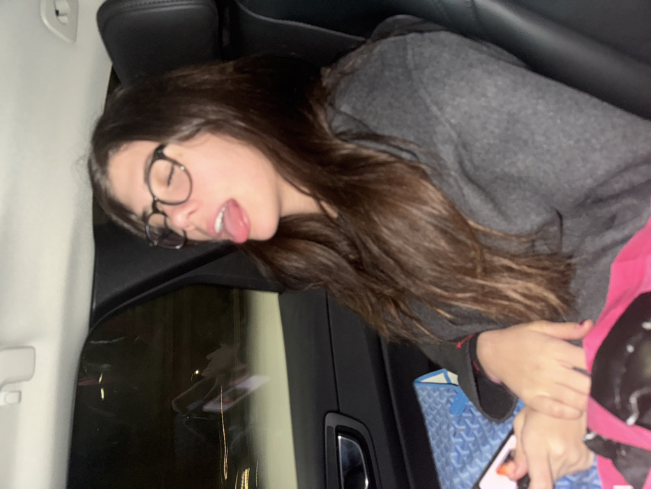 A woman with long brown hair and glasses is sticking her tongue out. She is wearing a gray sweater and appears to be leaning against the interior of a car, possibly in a backseat. Her eyes are closed, and her head is tilted to the side. A pink blanket or garment and a patterned blue tote bag are visible in the lower right corner of the frame. A phone is visible near her hands. The car's interior includes a black door panel and window.