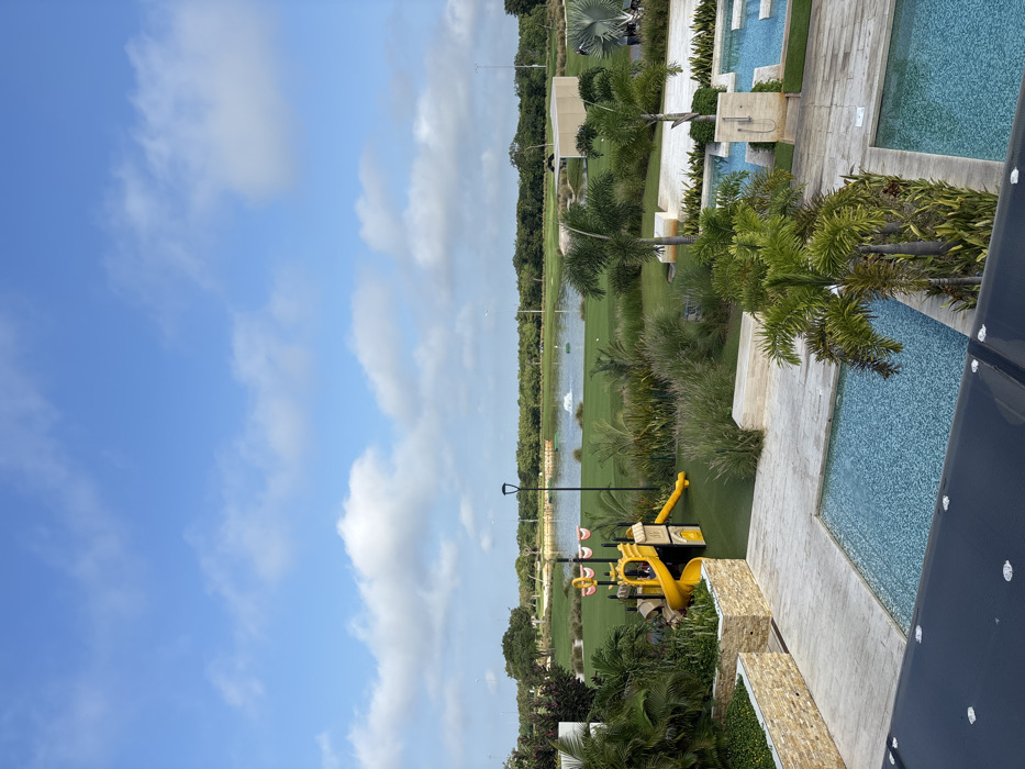 This image captures an outdoor recreational area in Komchén, Mexico, observed from an elevated viewpoint under a partly cloudy blue sky. The foreground shows a dark, angled roofline in the lower left, adjacent to three visible swimming pools with light blue mosaic tiling, integrated into light-colored stone paving. Palm trees and diverse green foliage are interspersed among the pools and along a stone-clad wall on the left. An outdoor shower fixture is positioned between two pools on the right. In the midground, a yellow multi-component children's playground structure, featuring slides and climbing elements, is situated on green artificial turf. A black street lamp stands near the playground. Beyond this, a large, calm body of water, consistent with a pond or lake, contains an active water fountain. This water body is bordered by expansive, manicured green grass, indicative of a golf course. The background reveals additional green landscapes, a dense treeline, a light-colored low-rise building, and distant utility poles on the right. No individuals are present within the scene.