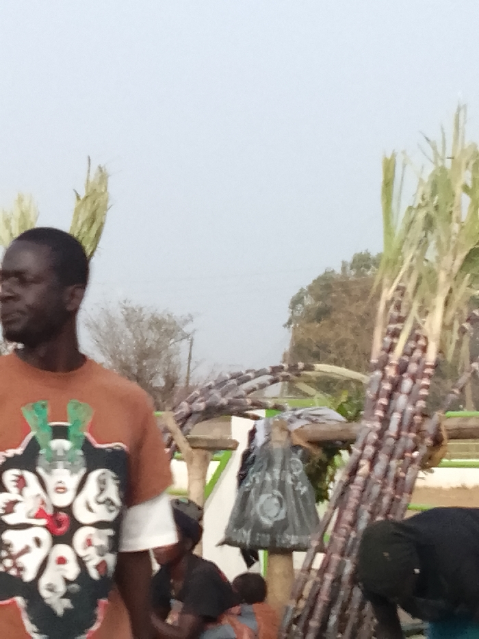 An outdoor scene in Panyam, Nigeria, depicts a gathering around displays of sugarcane