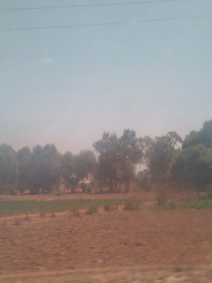 The image depicts a rural or semi-rural landscape located in Katon Rikkos, Nigeria, under a hazy, pale sky. The upper third of the frame shows a light blue sky transitioning to a warmer, dusty pale orange-brown near the horizon. Two faint, thin horizontal lines, possibly overhead wires, are visible in the upper left quadrant. The middle ground features a dense line of trees with green foliage, partially obscured by atmospheric haze or dust. Below the tree line, a narrow strip of green vegetation is visible, followed by the foreground, which consists of a wide expanse of reddish-brown, dry, tilled earth. No individuals, specific objects beyond natural elements, or discernible actions are present within the frame. The overall impression is a dry, open field landscape with distant trees, viewed through a dusty atmosphere.