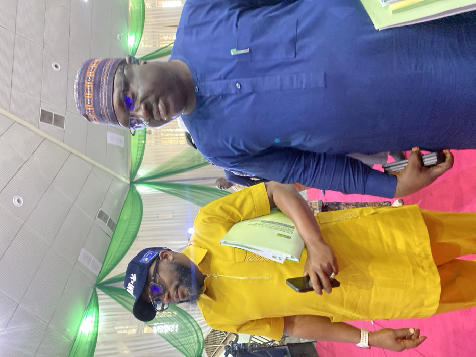 An indoor scene in Unguwar Sarki, Nigeria, depicts two men in the foreground, with additional blurred figures visible in the background. The man on the left wears a yellow short-sleeved tunic with intricate embroidery, yellow trousers, a black baseball cap with white lettering "ANI-N" and a small rectangular blue flag patch, and dark-rimmed sunglasses. He has a dark beard and a white smartwatch on his left wrist. His right hand holds a black smartphone, and his left arm cradles a light green folder or binder. The man on the right wears a blue long-sleeved traditional tunic with a four-button placket and a chest pocket containing a light green pen. He wears dark-rimmed prescription glasses and a patterned cap, likely a traditional Kufi or Fila, with blue, orange, and white geometric designs. He holds a dark rectangular object, possibly another smartphone, in his right hand, and a light green binder is partially visible, held in his left hand. Both men are looking generally towards the right side of the frame. The environment features a bright, well-lit space with a high ceiling containing recessed lights. The walls and ceiling are adorned with draping fabric in alternating shades of green and white. The floor is covered with a red carpet.