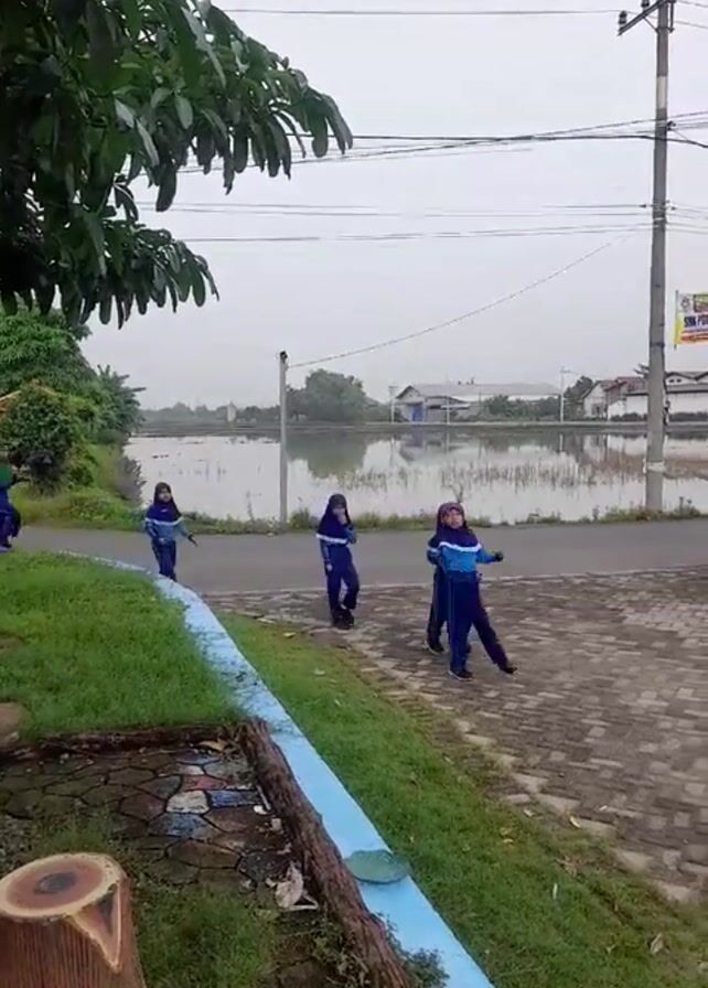 group of young people, possibly students, walking on a paved area next to a grassy area with trees. They are wearing matching blue outfits with hijabs. In the background, there is a road and a body of water, likely a pond or lake, with some buildings in the distance. The sky is overcast. There is a tree and a decorative log in the foreground. The camera follows the group as they move along the paved area.