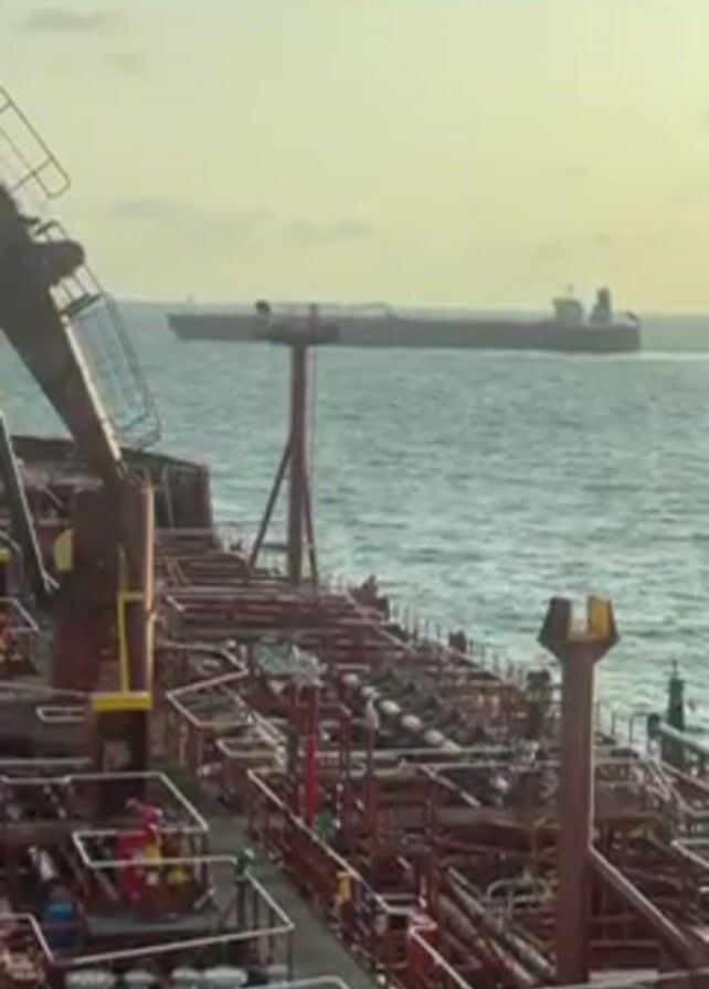 The view is of the open sea, from the deck of a large oil tanker, facing forward