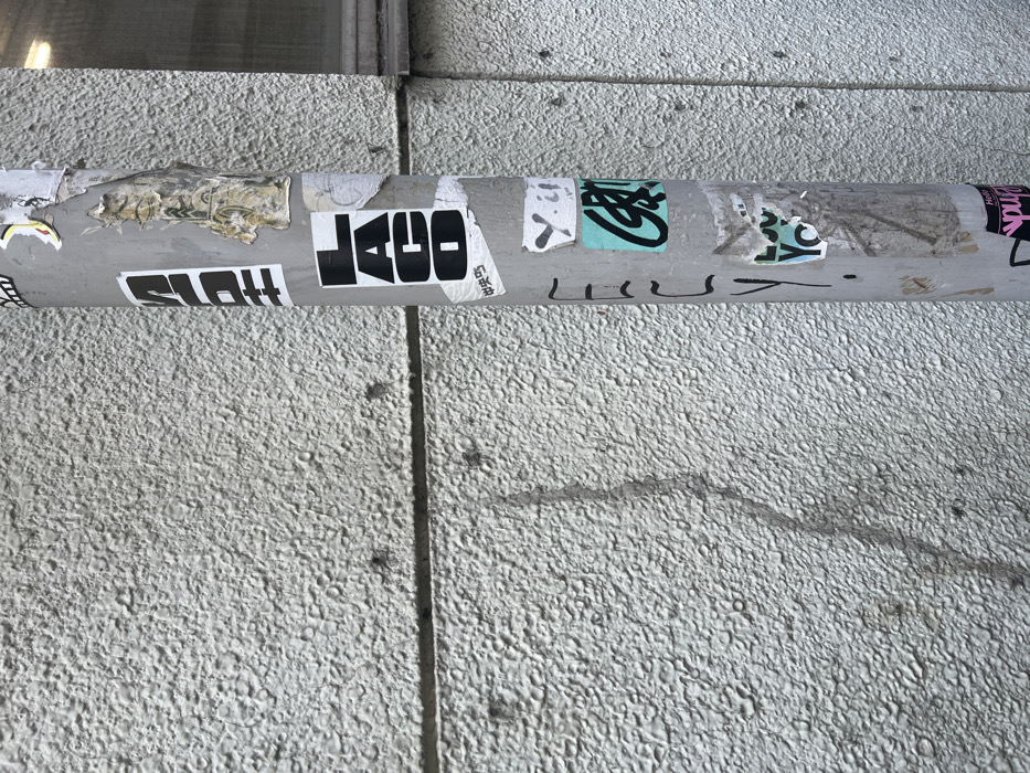 - "A gray cylindrical pole runs horizontally across the image, covered in various stickers" by FM-Te9wG2, licensed under CC BY 4.0