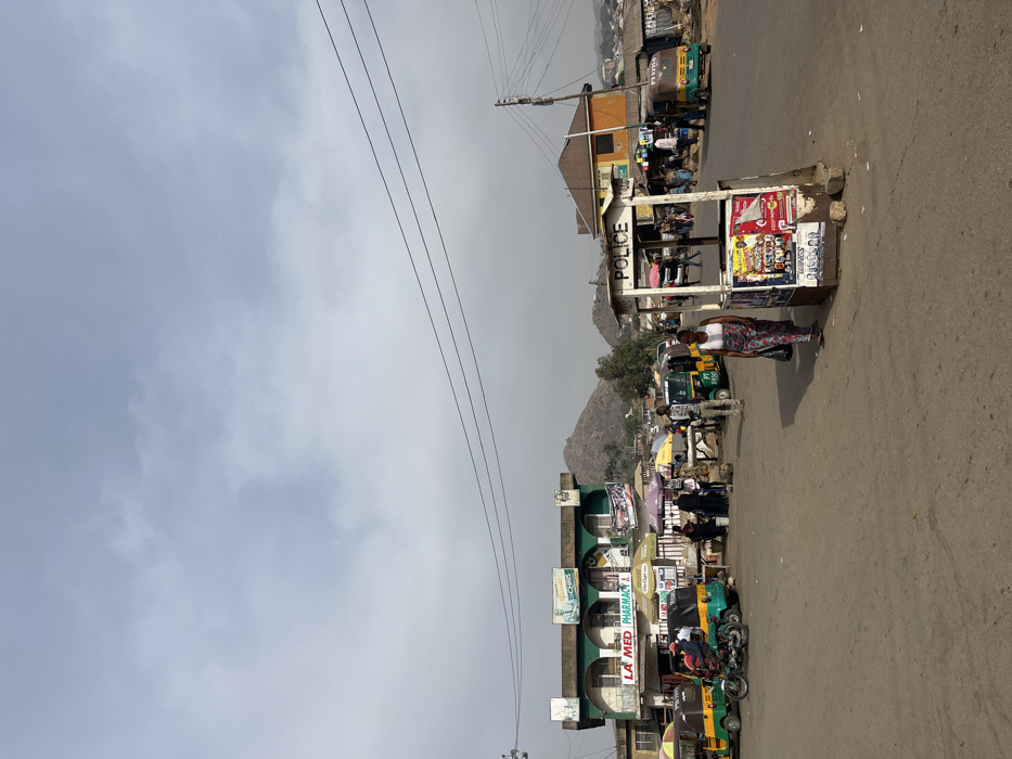 This image depicts a bustling street scene in the city of Gwong, Nigeria, under an overcast daytime sky. The environment features a combination of asphalt road and unpaved ground, with multiple overhead power lines and rocky hills visible in the distant background. A prominent two-story building on the left side of the street features a distinctive green-arched facade on its upper level. The ground floor houses "LA MED PHARMACY," indicated by clear signage, and is surrounded by various advertisements and market stalls with colorful umbrellas. In the right foreground, a small, open-sided, light-colored kiosk is labeled "POLICE" across its top and displays several posters on its lower panels. A woman, dressed in a white sleeveless top and a patterned skirt, walks from left to right past this police post, carrying a dark bag. Numerous individuals are present throughout the scene, walking, standing, and congregating near shops and stalls, suggesting a busy commercial district. Transportation is active, with multiple green and yellow three-wheeled auto-rickshaws (Keke Napep) parked and moving, particularly near the pharmacy, along with several motorcycles. Other multi-story and single-story buildings line the street further into the background.