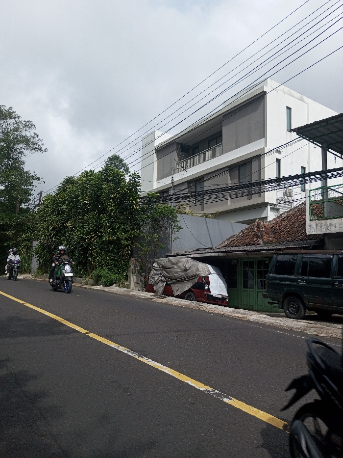This image depicts a street scene in Saing Ta Mawt Lay, Myanmar, under an overcast sky. The view is taken from a low perspective, looking along a paved road with a faded yellow center line. On the left side of the road, two individuals wearing helmets are operating motorcycles, moving away from the camera. The lead motorcycle is dark green with blue wheels. The left side of the thoroughfare is bordered by dense green foliage and trees behind a low wall. On the right side of the road, a multi-story building with a modern white and gray facade, featuring balconies with dark railings, is visible. Below and to the front of this structure is an older, single-story building characterized by a brown tiled roof and a corrugated metal awning extending over the sidewalk. Beneath this awning, a red vehicle is parked, largely obscured by a light-colored tarp, adjacent to a set of light green double doors. A dark green SUV is parked curbside to the right of this older structure. Numerous overhead utility lines are visible crossing the upper portion of the frame in front of the buildings. A black motorcycle's front wheel and fender are partially visible in the bottom right foreground.