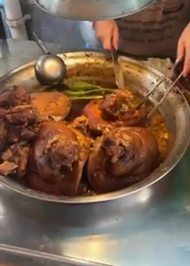 A close-up shot shows a large metal pan filled with braised pork hocks and other ingredients in a rich brown sauce