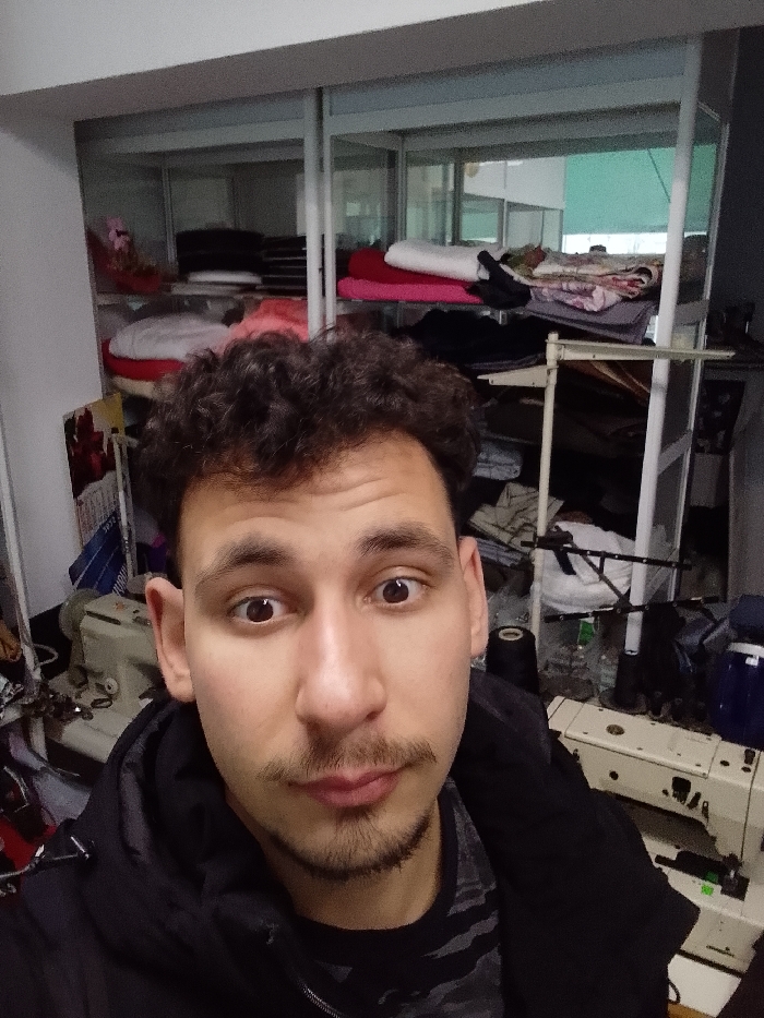 A male individual with dark, curly hair and a mustache/goatee is depicted in a close-up selfie, looking directly into the camera with wide eyes. He is wearing a black jacket over a striped shirt. The scene is an indoor textile workshop or tailor shop in Gorna Oryahovitsa, Bulgaria. Behind the individual, shelving units are visible, laden with various rolls and piles of fabric in different colors, including pink, red, white, black, and patterned materials. Two industrial-style sewing machines are positioned on work surfaces to the left and right of the subject in the lower portion of the frame. Miscellaneous items, such as spools of thread and tools, are also present on the shelves and surrounding the machinery. A reflective surface or window, partially obscured by a green blind, is visible in the upper right background.