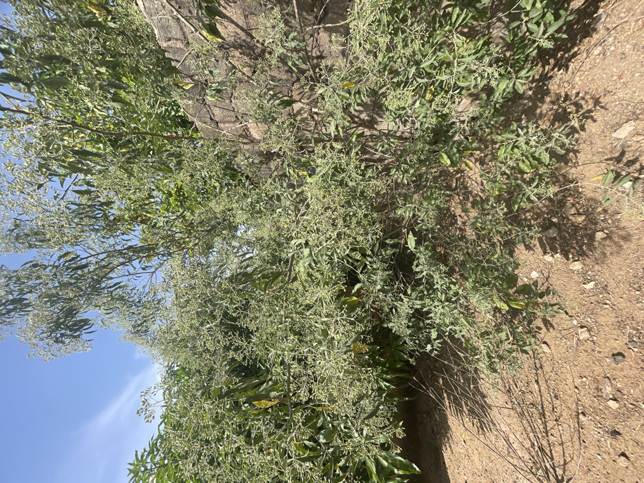 The image displays an outdoor scene in Jos, Nigeria, under a clear blue sky. The central and left portions of the frame are occupied by a dense shrub or small tree, heavily laden with numerous clusters of small, light-green buds or nascent flowers. Adjacent to this, on the left, foliage from another tree with darker green, broader leaves is visible. To the right, a rough-hewn stone wall, constructed from irregularly shaped grey and brown blocks, stands vertically, partially overgrown by the surrounding vegetation. The ground consists of dry, reddish-brown soil with scattered small stones and sparse, dead plant material, including several thin, bare twigs. Direct sunlight illuminates the scene, casting distinct shadows. No human or animal subjects are present.