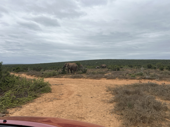 The image depicts a bushveld landscape under an overcast sky within the Sundays River Valley Local Municipality, South Africa. In the foreground, the top section of a reddish-brown vehicle is visible at the bottom of the frame, indicating the perspective from a vehicle. Two reddish-brown dirt tracks fork in the midground, surrounded by green and dry scrub vegetation. A large, light grey-brown African elephant stands prominently in the mid-right, facing left, appearing to feed from a dense green bush. Further in the distance, to the left and slightly behind the first elephant, a second, smaller elephant is partially visible amidst the vegetation. The background consists of a vast expanse of dense green bushveld extending to the horizon. The sky is uniformly grey with layered clouds, indicating an overcast condition.