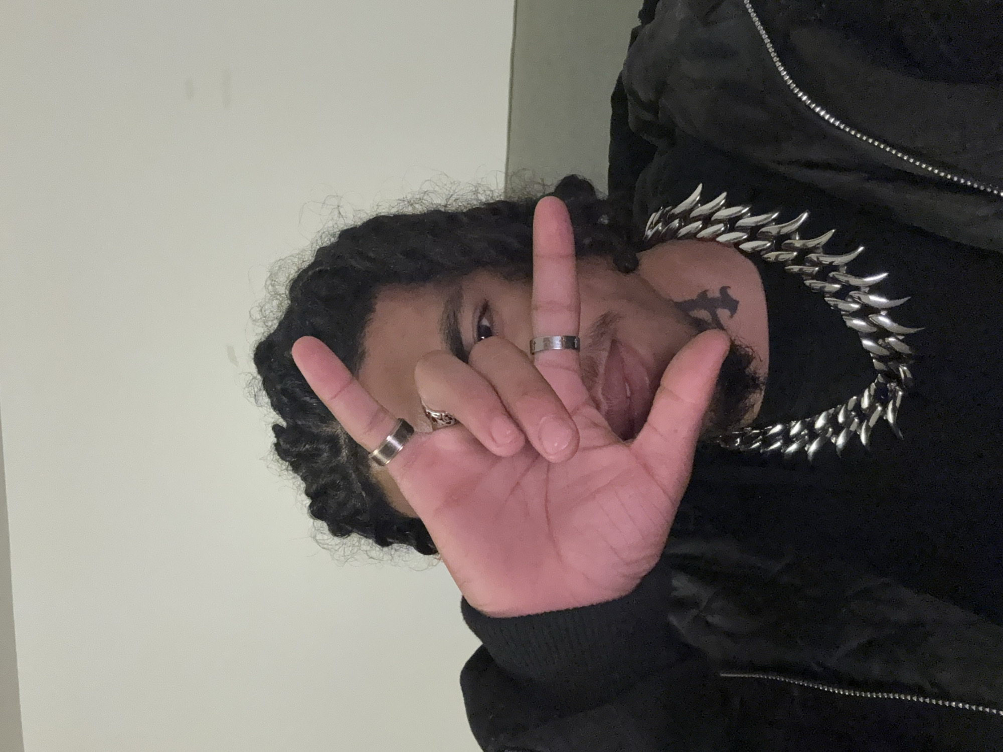 An individual is depicted in a medium close-up indoors in Massy, France. The subject, a male with dark, braided hair and a goatee, has their left hand raised, palm facing the camera, obscuring the lower half of their face. A portion of the right eye is visible, looking forward. The left hand displays three rings: a silver-toned band on the index finger, a patterned ring on the middle finger, and another silver-toned band on the ring finger. A black, stylized cross tattoo is visible on the left side of the neck. The individual wears a black long-sleeved garment under a black zippered jacket. A prominent, heavy silver-colored necklace with spiked links is around the neck. The background consists of a plain, light-colored wall, with a dark green upholstered surface visible to the right.